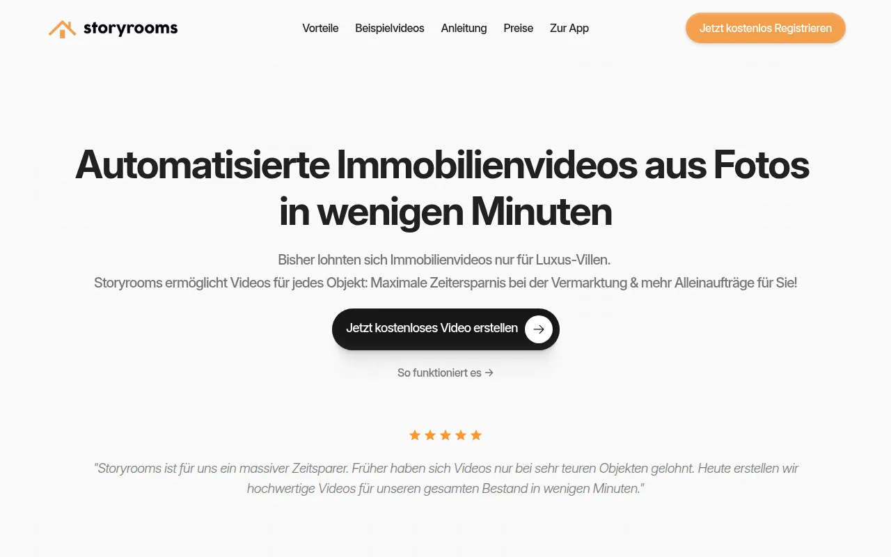 Storyrooms ist keine klassische App, die Sie im App Store herunterladen. Es ist eine spezialisierte Web-Plattform, die den Prozess der Videoproduktion für Makler radikal automatisiert.